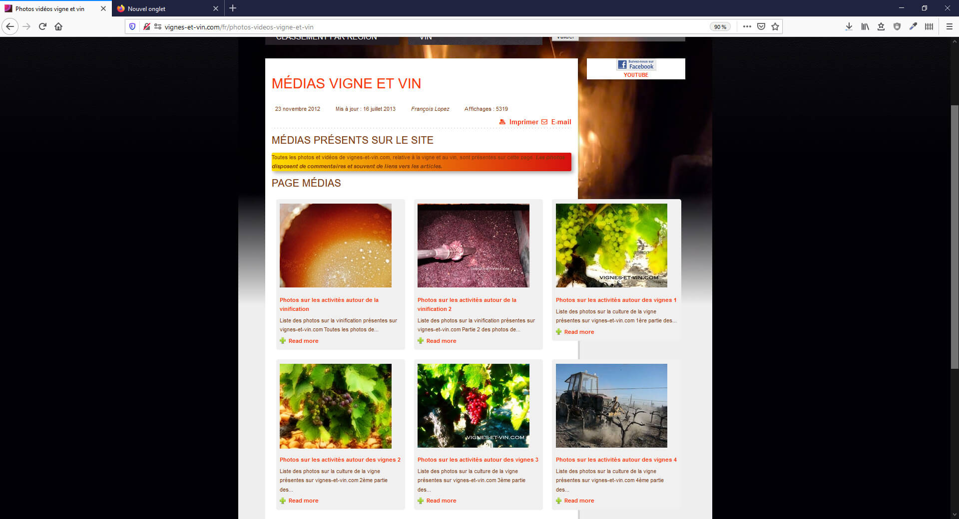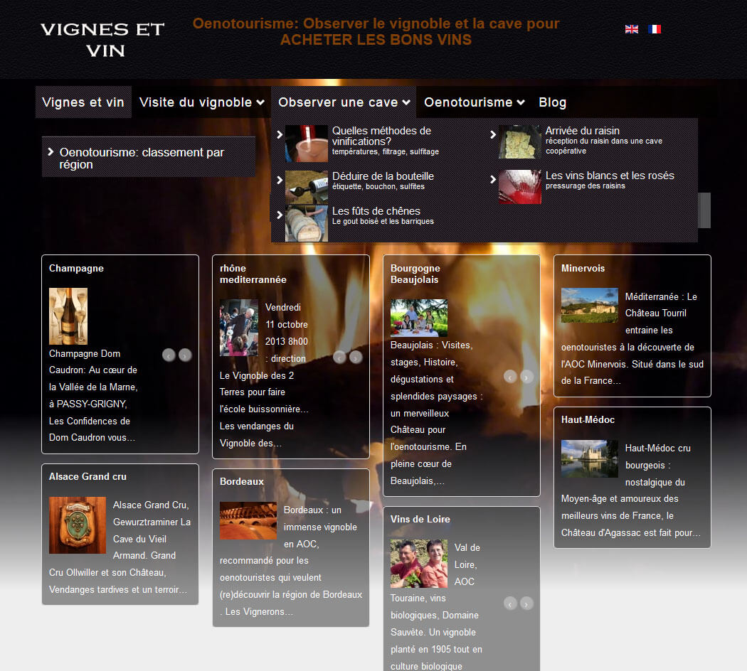 vignes-et-vin.com Bilingue, articles de fond avec différents auteurs, fiches touristiques et blog d'actualités. Affichage des posts sur facebook.