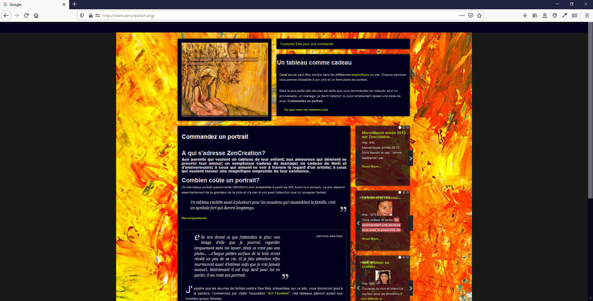 Photos et vidéos pour l'artiste peintre Elsa Bely, zencreation.org. Le site servait de vitrine pendant les expositions internationales où on ne pouvait pas tout transporter.
